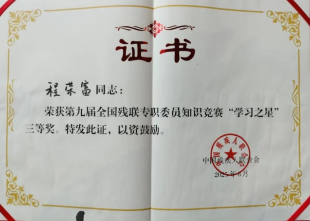 近日,第九届全国残联专职委员知识竞赛在山西大同举办,我市乐平十里岗镇残联专职委员程荣富在全国31个省(市、自治区)的近百名优秀基层残联专职委员中脱颖而出,荣获“学习之星”三等奖,并代表江西省参加团体赛,荣获团体优秀奖。